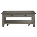 Inspired by the aesthetic of a casual country home and providing functional decorative accent for your living room is the occasional table set of the Granby Collection. The two-tone look of the acacia and pine solids base, finished in antique gray, and the oak veneer of the cocktail table’s coffee-finished top, presents as a harmonious combination of color, perfect for your home. Dark finished metal knob hardware fronts the functional drawers of the cocktail table while providing subtle contrast to the finish of the collection. An open display shelf creates a perfect spot for display of your decorative accessories, while casters allow for ease of movement of the cocktail table within your space. 48 x 26 x 20H